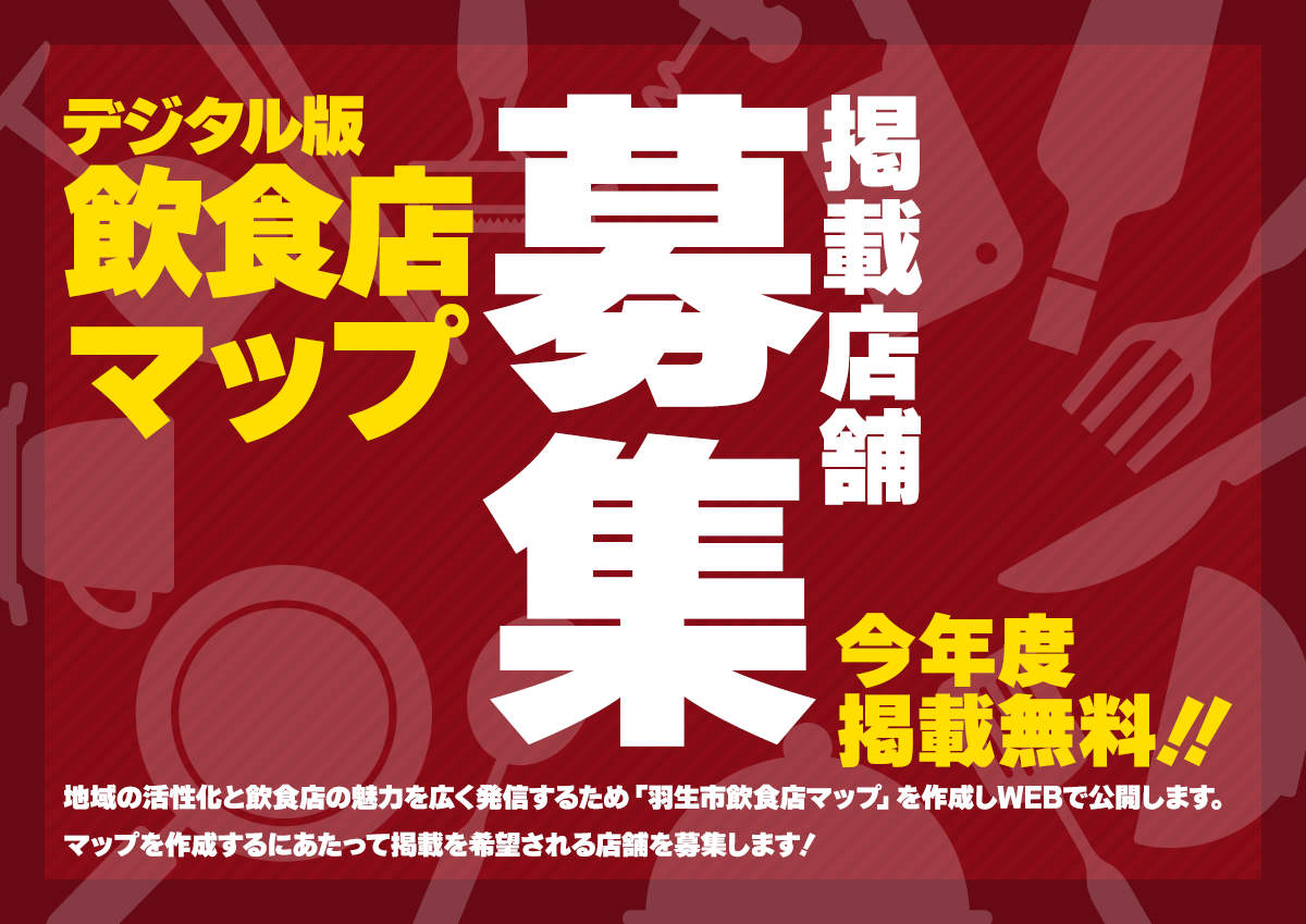 ・本事業では、羽生市内に事業所を有する飲食店を対象に情報を収集し、「羽生市飲食店マップ(デジタル版)」としてウェブサイト上に掲載いたします。